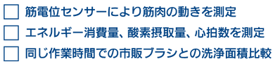 呼気ガス分析では、市販ブラシと比べてトラックモップはエネルギー消費量・酸素摂取量・心拍数がすべて低いという結果が出ました。つまり、体への負担や疲れ方が少ないということです。特に体力が低めの人ほど効果が大きく、誰でも使いやすい省エネルギーなツールといえます。